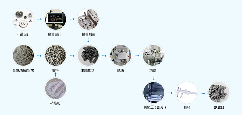 金屬粉末注射成型-將金屬粉末通過(guò)與粘合劑混合后利用注塑機(jī)通過(guò)成型成我們需要的產(chǎn)品。再經(jīng)過(guò)脫脂燒結(jié)緩解制成金屬配件,大大地降低了生產(chǎn)成本,提高了生產(chǎn)效率和產(chǎn)品進(jìn)度。